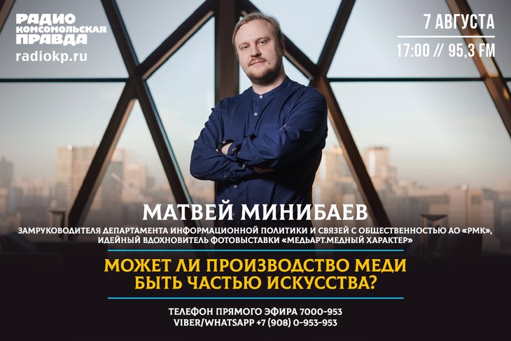 В Челябинском музее изобразительных искусств открывается уникальная фотовыставка «Медь.Арт. Медный характер». Экспозиция, которая продлится до 24 августа и будет доступна всем желающим совершенно бесплатно, покажет жителям и гостям города «медный характер» металлургов и горняков – и все это глазами пяти талантливых фотографов. В чем уникальность фотовыставки? Может ли процесс производства меди быть частью искусства? Какие черты характера человека труда фотографам удалось передать? Гость эфира на радио "Комсомольская правда" (95.3FM) - заместитель руководителя департамента информационной политики и связей с общественностью АО «РМК», идейный вдохновитель фотовыставки «МедьАрт.Медный характер» Матвей МИНИБАЕВ