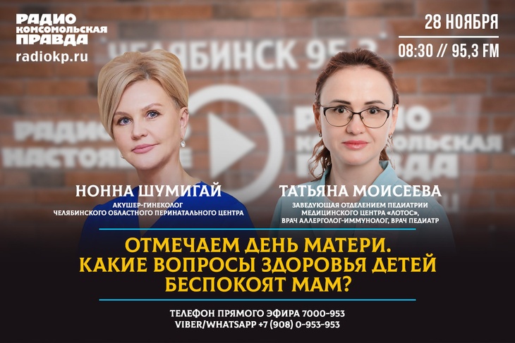 В России 30 ноября отмечают День матери. Что как не материнская любовь и забота составляет здоровье и силу нации! Однако многие моменты, связанные с материнством, становятся для мам настоящим испытанием. Какие вопросы здоровья своего и ребенка беспокоят мам сегодня? Довольны ли они ведением беременности? Как они относятся к прививкам? Беспокоит ли вопрос гиподинамии детей? Гости эфира на радио «Комсомольская правда» (95.3FM) - акушер-гинеколог Челябинского областного перинатального центра Нонна ШУМИГАЙ и заведующая отделением педиатрии медицинского центра «Лотос», врач аллерголог-иммунолог, врач педиатр Татьяна МОИСЕЕВА