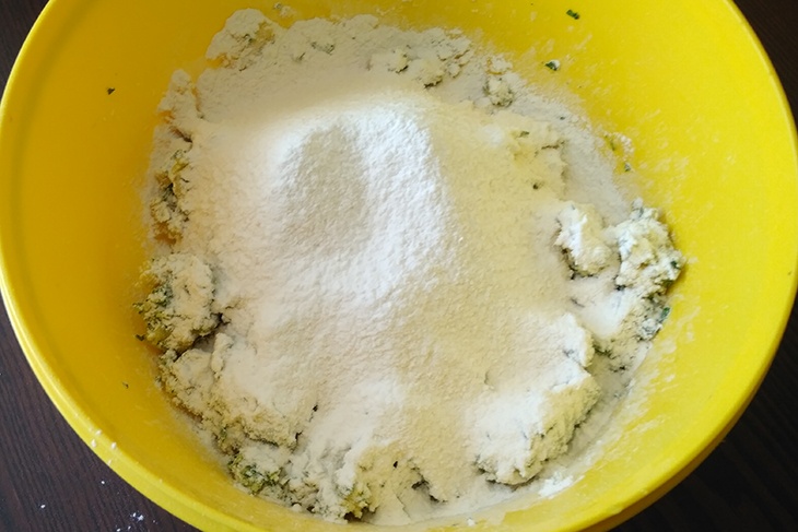 Затем остудите и почистите картофель, сделайте пюре. Добавьте в получившуюся массу чайную ложку соли, столовую ложку оливкового масла и пучок мелко нарубленной петрушки без стеблей. Просейте туда же стакан пшеничной муки.