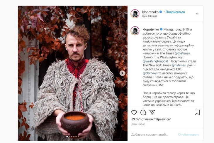 «Мы не просто заявили о том, что борщ — украинский. Мы оказали сопротивление России и ее пропаганде, и нас поддержал мир», — подчеркнул он в своем Instagram.