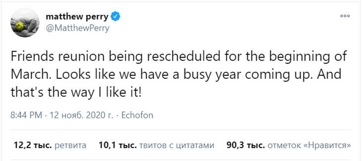 «Встреча "Друзей" переносится на начало марта. Похоже, нас ждет насыщенный год. И мне это нравится!» — написал актер в своем Твиттере.