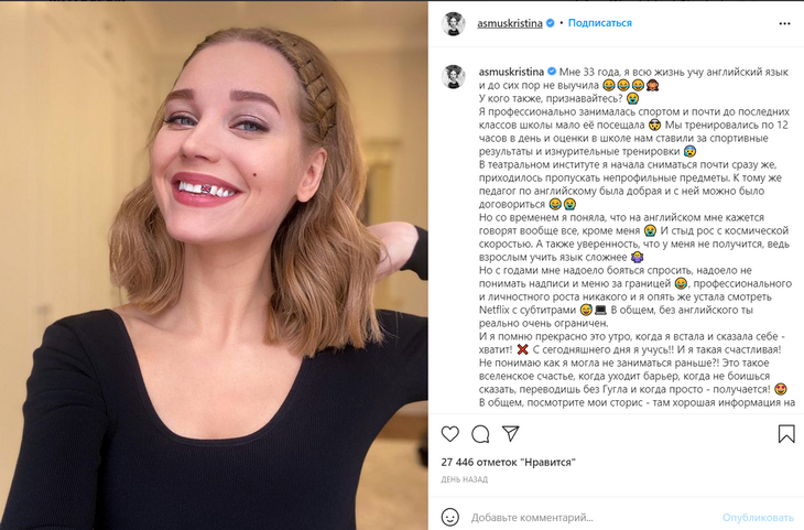 Кристина Асмус решила рассказать своим поклонникам в Инстаграме о том, почему в свои 33 года не владеет английским языком. Оказывается, это не единственное, что прошло мимо нее в школе.