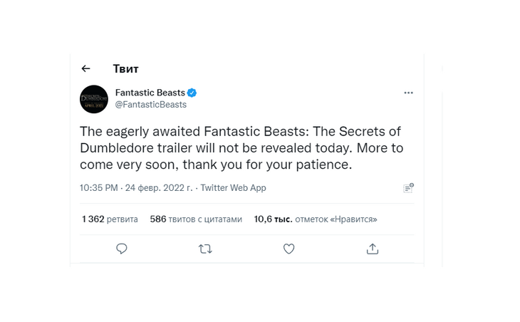 «Долгожданный трейлер фильма "Фантастические твари: Тайны Дамблдора" сегодня не будет показан. Подробности появятся очень скоро, спасибо за ваше терпение», — отметили создатели фильма.