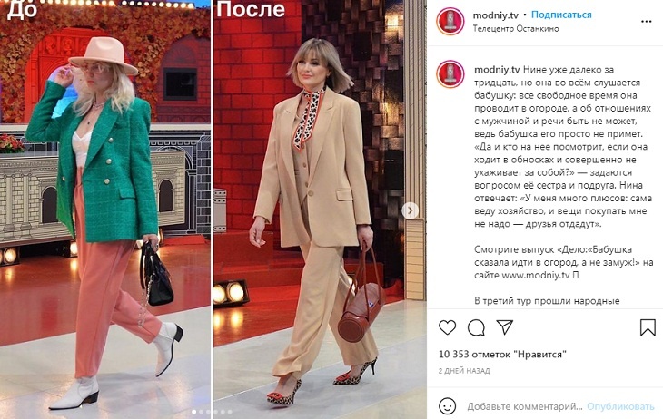 «И цвет, этот оттенок бежевого, очень приятный. Наша героиня выглядит в нем как ириска, как сгущенное молоко», — заметила Эвелина Хромченко.