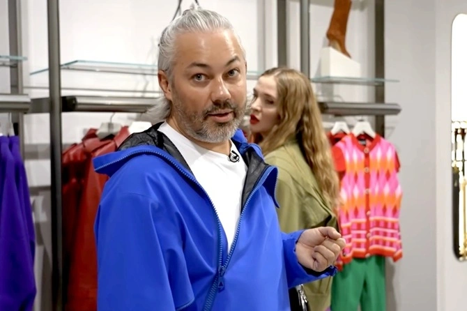 В ходе программы Рогов обратил внимание на мягкие остроносые ботильоны цвета слоновой кости с золотистым каблуком-шпилькой. Он отметил, что к такой паре отлично подойдет жакет с аналогичными золотыми пуговицами.