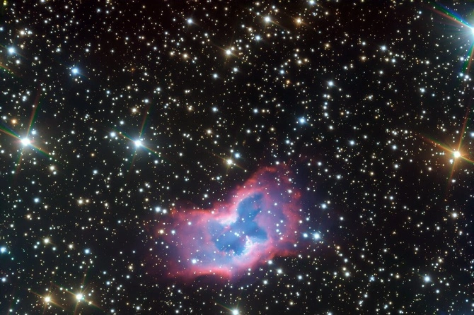 Европейская Южная обсерватория (ESО) поделилась потрясающим изображением «космической бабочки» — так называют газовую туманность NGC 2899, которая по своей сложной структуре и цветовой палитре напоминает порхающее в ночном небе насекомое.