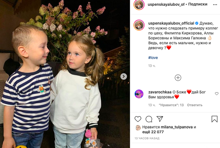 «Думаю, что нужно следовать примеру коллег по цеху: Филиппа Киркорова, Аллы Борисовны и Максима Галкина. Ведь если есть мальчик, нужно и девочку?» — задалась вопросом Успенская.