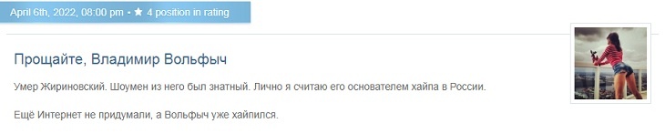 «Умер Жириновский. Шоумен из него был знатный. Лично я считаю его основателем хайпа в России. Еще Интернет не придумали, а Вольфыч уже хайпился», — написала в своем ЖЖ Миро.