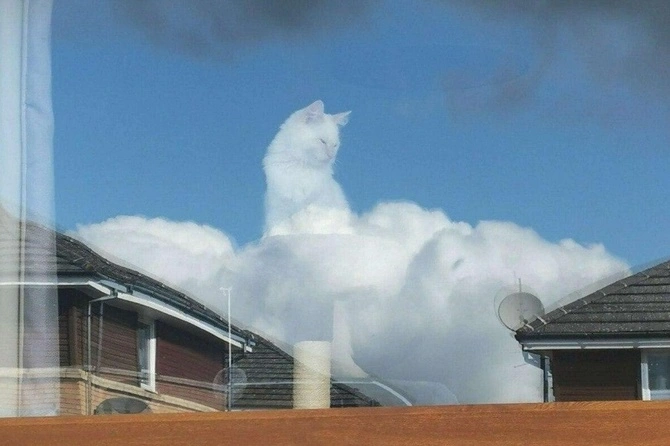А поскольку на небе в этот момент такие же снежно-белые и пушистые облака, снимок получился очень концептуальным. При этом еще и выражение морды у котика соответственное – благостное и слегка снисходительное.