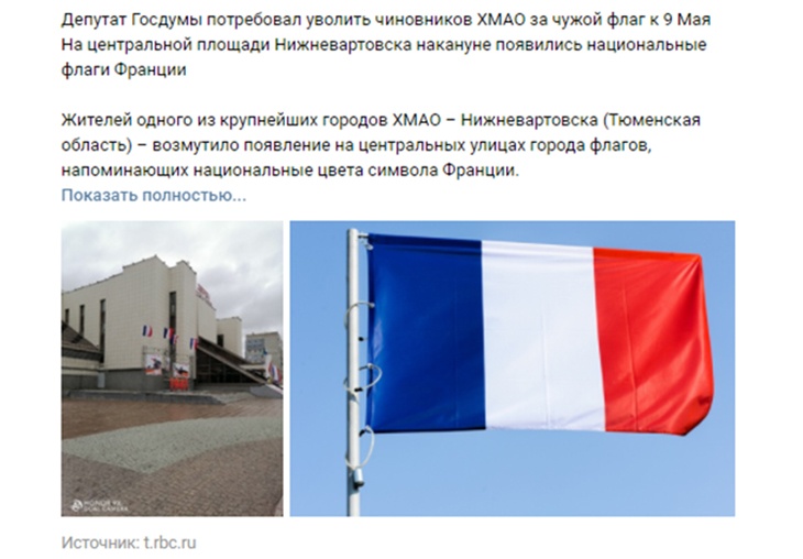 Жители Нижневартовска обнаружили у местного Дворца искусств необычные флаги. Рядом с украшениями в честь Дня Победы установили флаги, которые выглядят как французские. Многие были возмущены кадрами, снятыми в центре города.