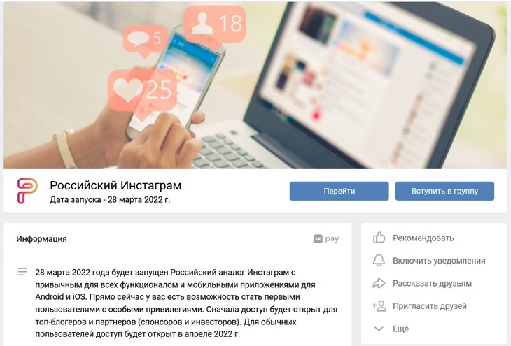 «28 марта 2022 года будет запущен российский аналог Instagram с привычным для всех функционалом и мобильными приложениями для Android и iOS. Прямо сейчас у вас есть возможность стать первыми пользователями с особыми привилегиями. Сначала доступ будет открыт для топ-блогеров и партнеров (спонсоров и инвесторов). Для обычных пользователей доступ будет открыт в апреле», — говорится в группе Россграма в ВК.