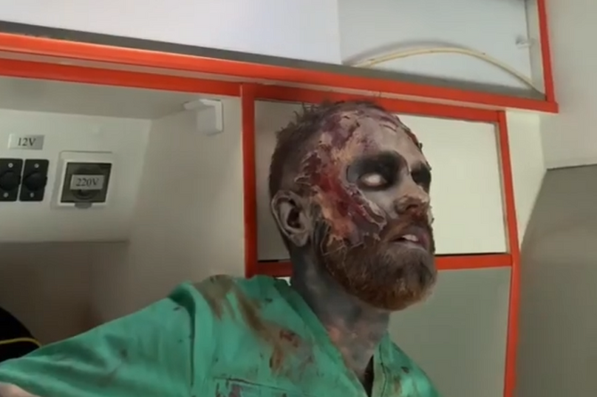 В Ростове-на-Дону полиция проводит проверку после появления в соцсетях видеозаписи, на которой «зомби» в гриме мертвеца и наряде врача катается по городу на скорой с включенными спецсигналами и пугает прохожих.