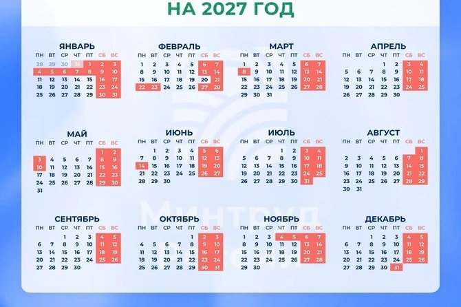Минтруд России разработал проект постановления правительства о переносе выходных дней на 2027 год, в соответствии с которым новогодние праздники продлятся с 31 декабря по 10 января.