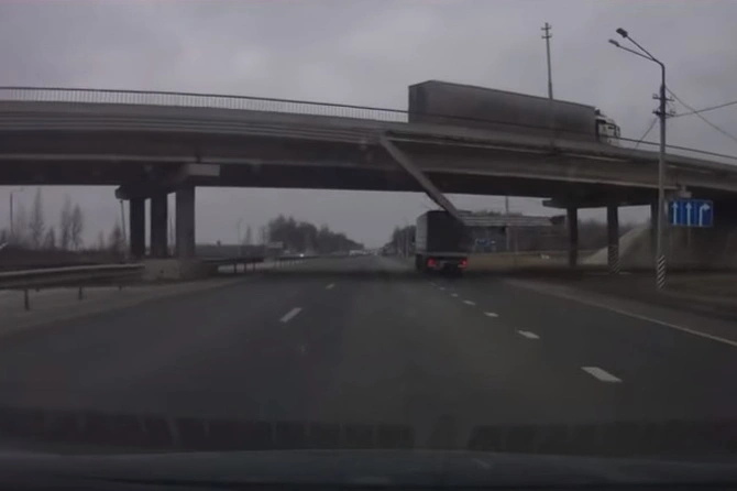 Это произошло на дороге М7 на Южном объезде. Момент обрушения запечатлела камера видеорегистратора. На кадрах видно, что с моста падает часть парапета. Это произошло как раз перед машиной, в которой был видеорегистратор. Водитель быстро уворачивается влево, чтобы не попасть под летящие обломки.