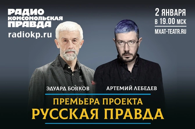 - Здравствуйте, дорогие слушатели Радио «Комсомольская правда». Сегодня первый выпуск передачи «Русская правда». Громкое, амбициозное, если не претенциозное название, не так ли, Артемий? Начну с главного. Скажу, что мы затеяли эту передачу, для того чтобы поискать возможность говорить о главных вещах в жизни человека. Я буду пробовать вытаскивать моих собеседников из их медийных образов, из их ролей, буду стремиться выводить их на разговор о самом главном, буду искать темы, которые действительно человека волнуют по-настоящему. При этом расположение к собеседнику, в моем представлении, является важнейшим и наипервейшим условием, для того чтобы вообще тратить некоторое количество времени на диалог.