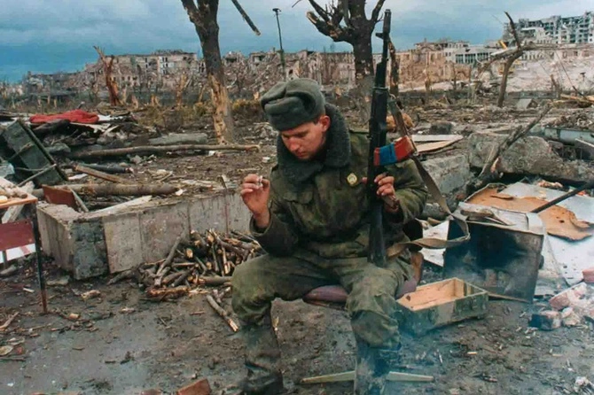 Первая Чеченская война. 1995 год. Солдат российской армии курит у костра в центре разрушенного Грозного. Фото: Владимир Веленгурин.