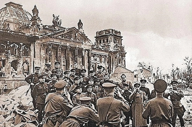 Необычный снимок: советские военкоры у Рейхстага фотографируют друг друга. Берлин, 5 мая 1945 г.