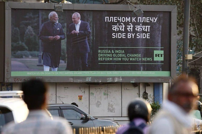«Премьер-министр Нарендра Моди и президент России Владимир Путин стоят бок о бок, провозглашая: "Индия — Россия: движущие силы глобальных перемен"», — подчеркивает телеканал.