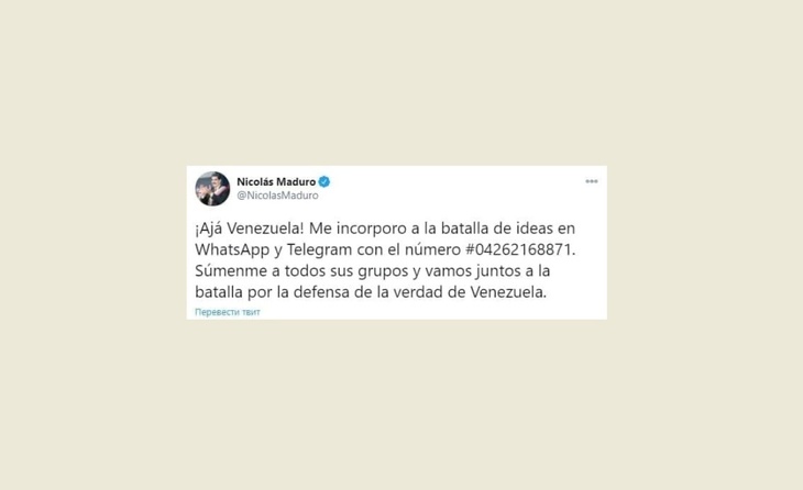 «Вот мой телефон: 04262168871. Включайте меня в свои группы», — сообщил Мадуро подписчикам.