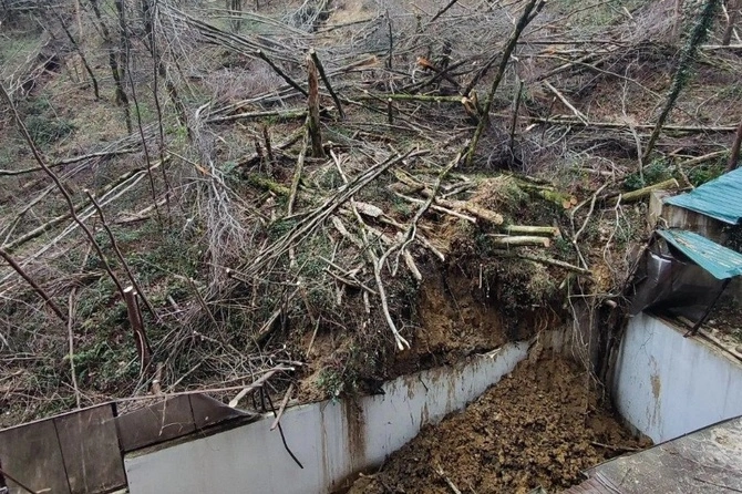 Многоэтажный дом располагается под склоном. Примерно с 10-х чисел января люди стали замечать явные признаки схода оползня. По словам местной жительницы Ирины, на горе кто-то вел стройку, а теперь идут дожди, грунт пополз вниз, во двор валятся деревья.