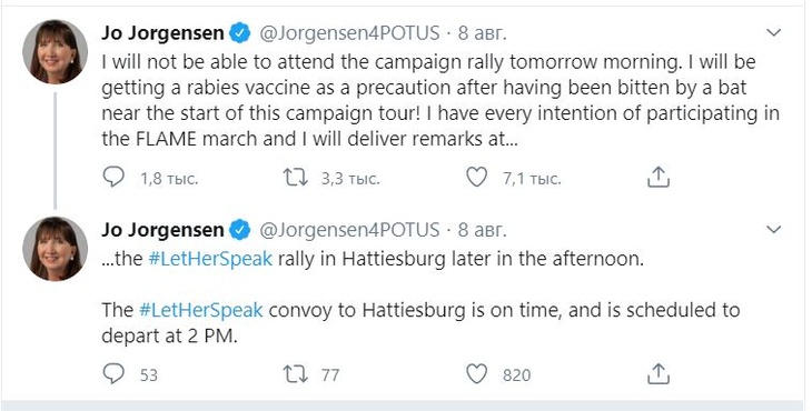 Необычный случай вмешательства в президентские выборы зафиксирован в Соединенных Штатах. Кандидат от Либертарианской партии Джо Джоргенсен рассказала, что практически в начале предвыборной кампании ее укусила летучая мышь.