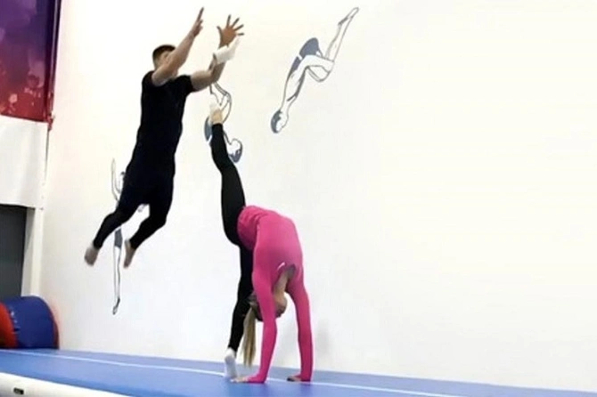 На записи Спиридонова стоит в мостике, поднимая ногу до вертикального шпагата. На носке ноги она держит рулон туалетной бумаги. Нагорный с разбегу прыгает над ней и делает сальто, в полете подхватывая этот рулон.