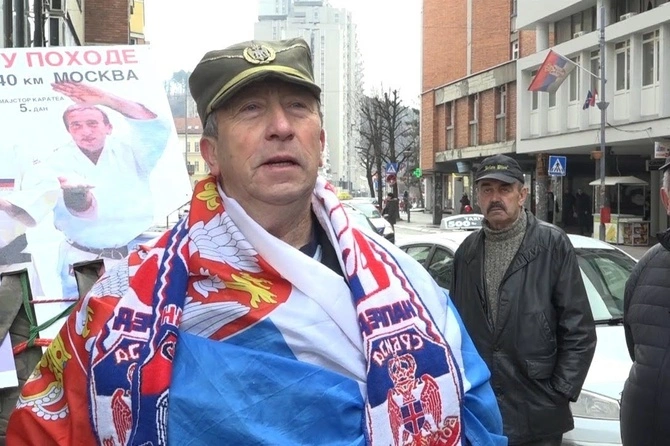 Как рассказал Милутинович журналистам, ему удалось преодолеть уже почти 200 километров пути. За его плечами рюкзак с прикрепленным к нему флагом его страны.