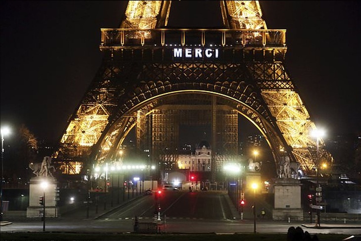 Световая индикация с благодарственной надписью впервые включилась 27 марта, в 8 часов вечера, сообщает британская газета Daily Mail. И в это же время раздались аплодисменты, которыми парижане из окон своих домов соглашались со словами, высветившимися в темноте вечерней столицы.