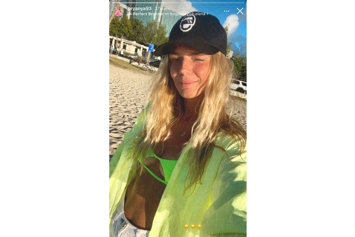 Девушка на фото предстала в ярко-салатовом мини-бикини. Особая форма крошечного лифа-бандо продемонстрировала самую пикантную часть тела: загорелые и упругие груди спортсменки едва держались в купальнике.