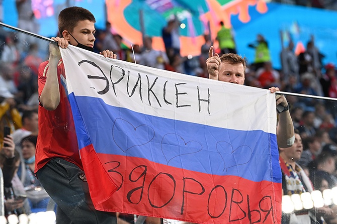 Российские болельщики во время матча Россия-Бельгия желают здоровья Кристиану Эриксену.