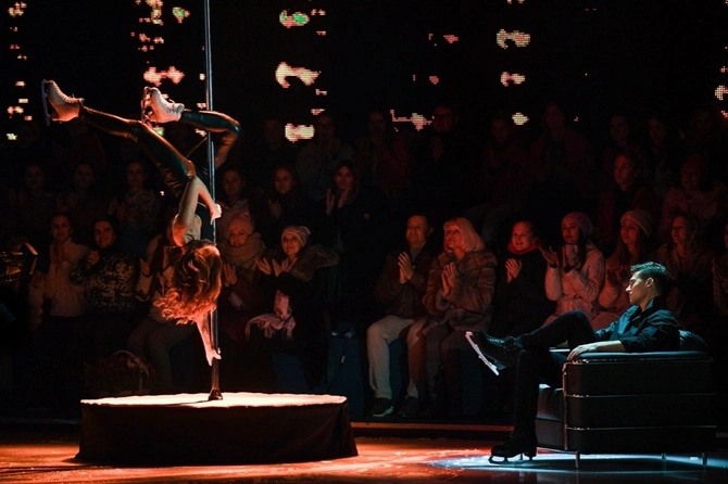 Латышская красотка в начале номера и в конце поднялась на шест и безупречно исполнила несколько страстных движений для Энберта.