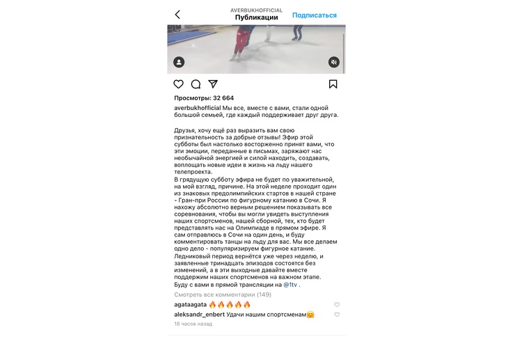«Я нахожу абсолютно верным решение показывать все соревнования, чтобы вы могли увидеть выступления наших спортсменов, нашей сборной, тех, кто будет представлять нас на Олимпиаде», — дал разъяснения Авербух в личном микроблоге в Instagram.