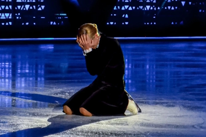 В конце номера звезда льда не удержалась и расплакалась, после того, как ее партнер, согласно сюжету, покончил жизнью самоубийством.