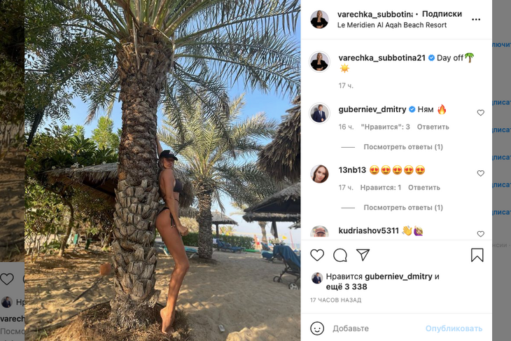 На этот раз эффектная блондинка нарядилась в сногсшибательный купальник темного цвета и отправилась к Оманскому заливу. У пляжа Субботина нежно прильнула упругими ягодицами к пальме и сделала снимок на память.