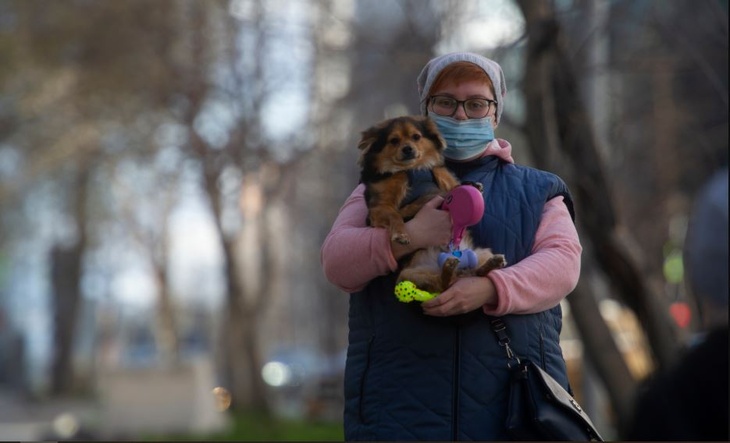 Женщина в медицинской маске с собачкой на руках во время режима самоизоляции. Архивное фото