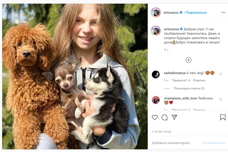 «Доброе утро! У нас прибавление! Знакомьтесь, Джек, в скором будущем хранитель нашего дома. Добро пожаловать в семью!» — так Трусова подписала в Instagram фотографию своей новой сибирской хаски по кличке Джек.