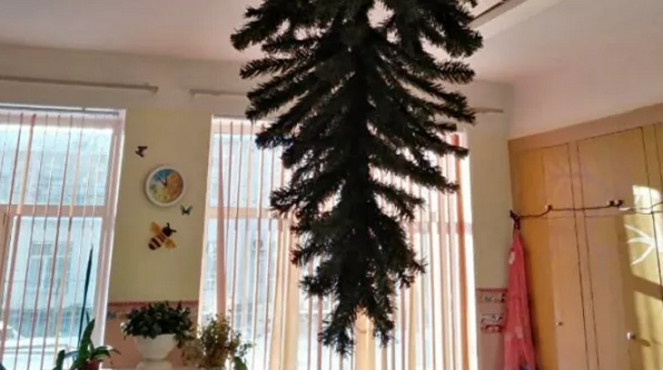 В детском саду № 241 Омска родители весьма креативно решили проблему расположения елки - так, чтобы играющие и бегающие дети не повредили ее и не травмировали себя. Новогоднее дерево прикрепили к потолку.