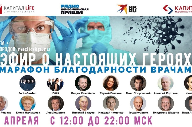 Радио «КП» проведет марафон благодарности врачам «Эфир о настоящих героях». В музыкальном «пробеге» примут участие звезды российской и зарубежной эстрады. Эфир состоится 26 апреля с 12:00 по 22:00 по московскому времени.