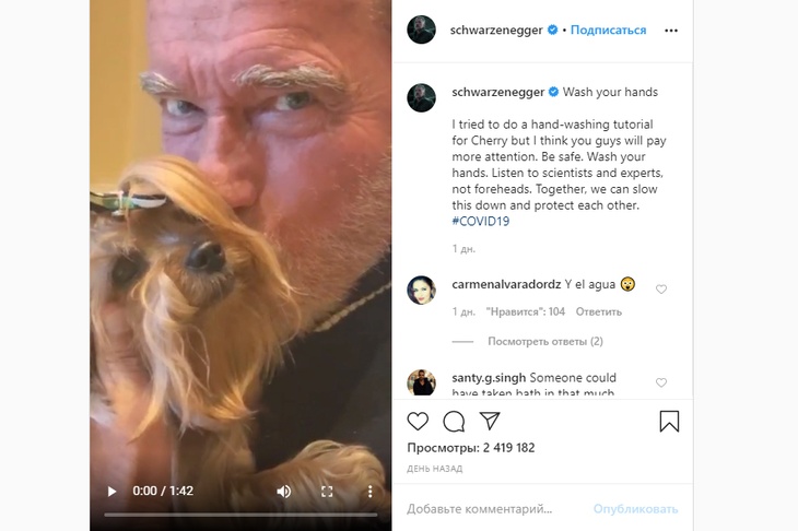 Знаменитости моют руки под известную песню Глории Гейнор «I will Survive» («Я выживу», перевод с английского, прим. ред.). Хью Джекман и прочие известные люди последовали примеру певицы. Арнольд Шварценеггер даже свою собаку по кличке Черри учит мыть руки — точнее, лапы.