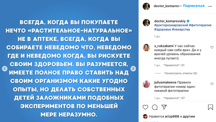 «Когда вы покупаете нечто “растительное-натуральное” не в аптеке, всегда, когда вы собираете неведомо что, неведомо где и неведомо когда, вы рискуете своим здоровьем», — написал он.