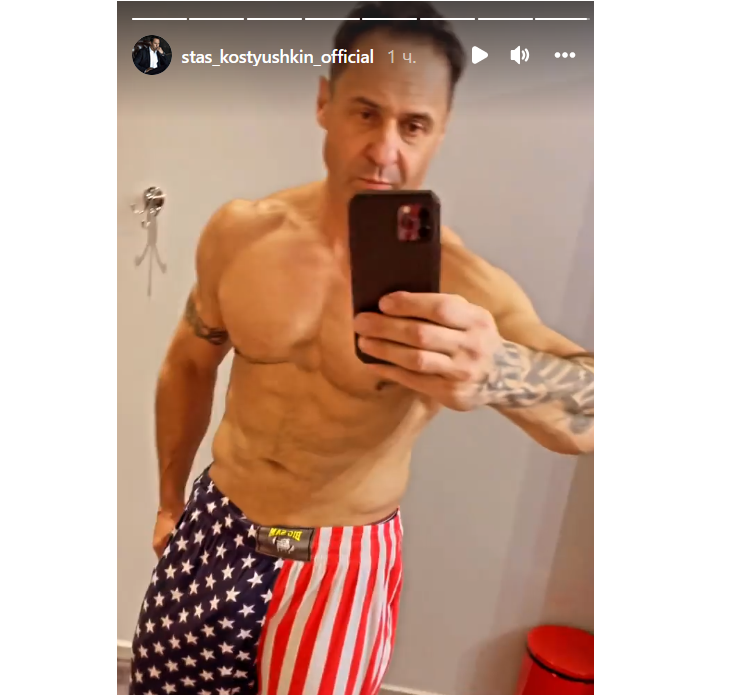 50-летний артист запечатлелся «без фотошопа», чтобы продемонстрировать обнаженный торс. Костюшкин позирует в штанах с принтом американского флага, показывая накачанный пресс.