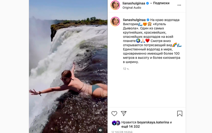 Сегодня Лиана показала новое видео из отпуска. В кадре она позировала в оливковом бикини и солнечных очках у края водопада «Виктория».