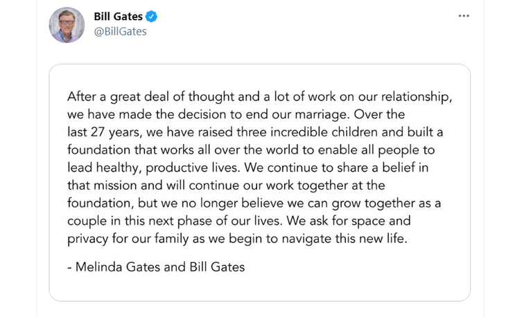 Сооснователь Microsoft Билл Гейтс и его жена Мелинда объявили о своем разводе после 27 лет брака. Пост об этом появился в Twitter Гейтса и подписан от имени обоих супругов.