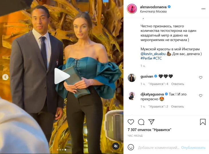 Водонаева опубликовала несколько кадров и видеоролик, на которых запечатлена с российским регбистом Кевином Акуабу.