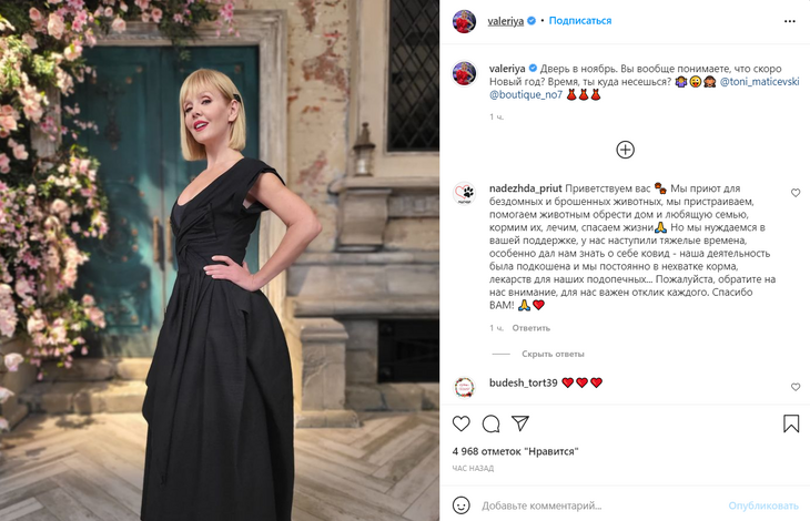 Валерия напомнила своим фанатам, что Новый год уже не за горами, и примерила изысканный образ, который подошел бы для любого праздника. Черное платье с глубоким декольте и пышной юбкой подчеркнуло стройную фигуру звезды.