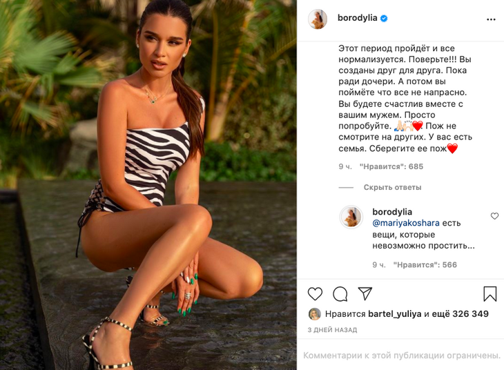 Сегодня Бородина дважды намекнула на измену и возможный развод с Омаровым. В последнем посте в Instagram она написала проникновенное стихотворение, а подписчики задались вопросом, что стряслось у звезды. Одна из поклонниц пожелала Бородиной сохранить семью ради дочерей.