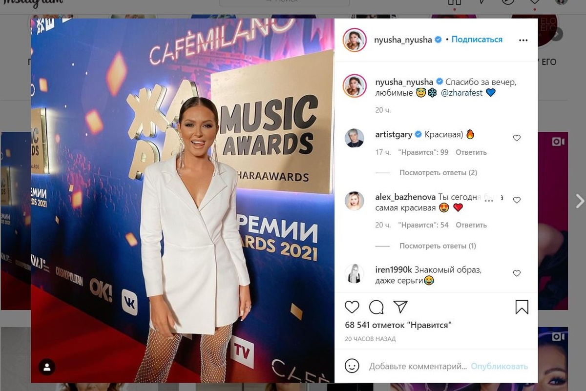 «Ты сегодня была самая красивая», «Затмила всех», «Ты сегодня была сногсшибательной, Нююю», «Боже, красотка», «Роскошная Нюшенька!!! Как всегда, идеальная!!! Просто, недостижимо красива!!!», «Богиня ты наша», — написали они.