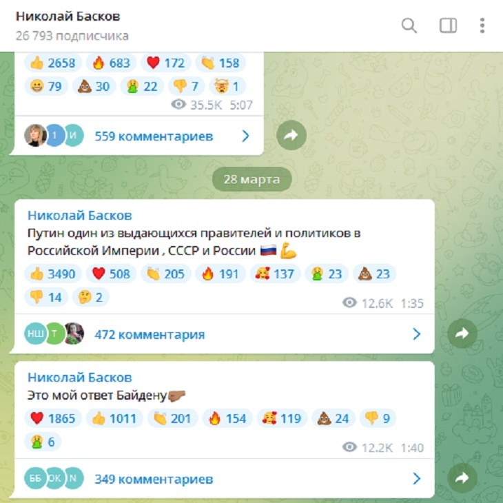 «Путин один из выдающихся правителей и политиков в Российской империи, СССР и России», — написал в новой публикации Басков.
