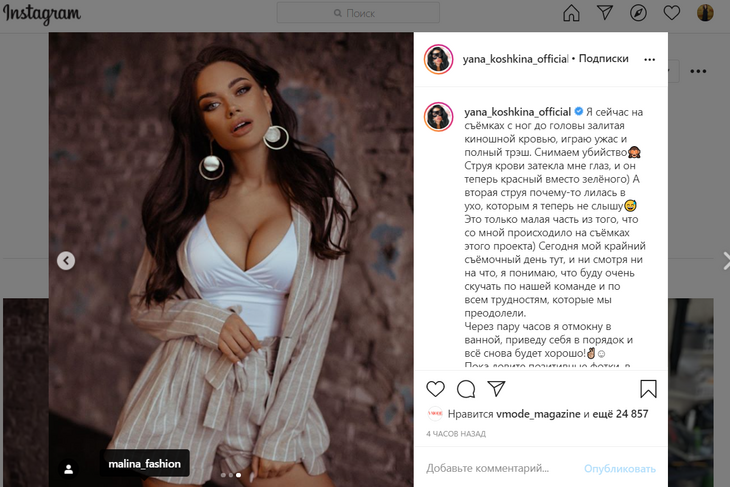 В комментариях девушку поспешили поддержать. «Вы как всегда на позитиве. Даже в кровище», «Главное, чтобы кровь только в фильме», «Лучше бы мультики озвучивала», «Вы шикарны даже в крови», — писали они.