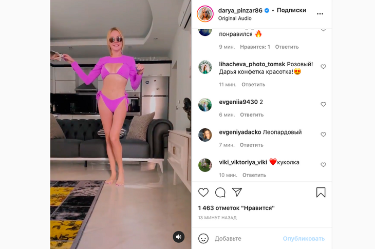 По традиции первым делом блогерша показала обновки поклонникам. Дарья записала видео, на котором позировала в трех разных бикини: ярко-оранжевом, фиалковом и с принтом под шкуру леопарда.